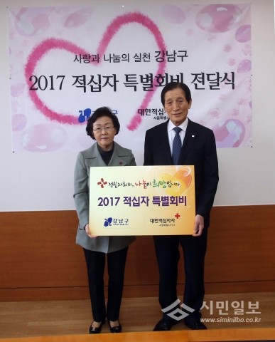 최근 신연희 서울 강남구청장은 구청에서 대한적십자사에 적십자 특별회비를 전달했다. 사진은 신 구청장(왼쪽)과 제타룡 대한적십자사 서울특별시지사 회장(오른쪽)이 전달식 후 기념사진 촬영을 하고 있는 모습.(사진제공=강남구청)