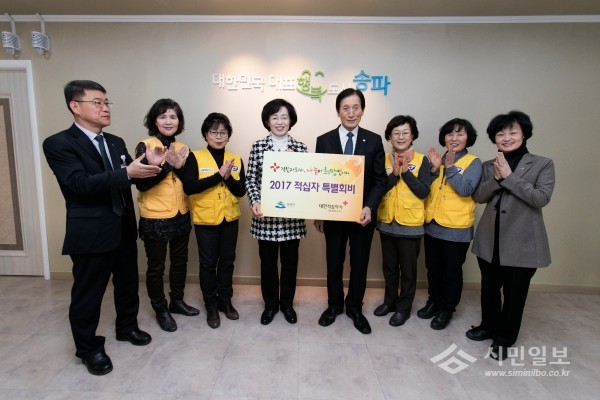 최근 박춘희 서울 송파구청장은 구청장실에서 대한적십자사 서울지사에 적십자 특별회비를 전달했다. 사진은 박 구청장(왼쪽 네번째)과 제타룡 대한적십자사 서울지사 회장(오른쪽에서 네번째) 등 관계자들이 기념사진 촬영을 하는 모습.(사진제공=송파구청)