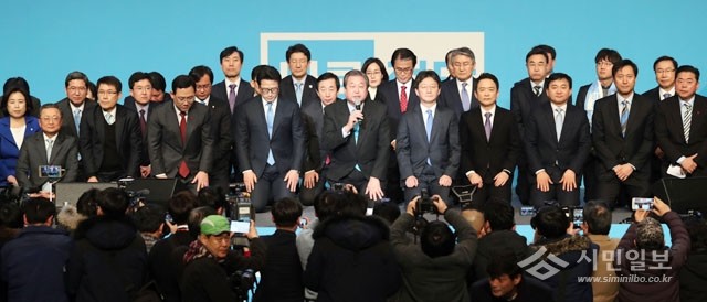 24일 서울 송파구 올림픽공원 올림픽홀에서 열린 바른정당 창당대회에서 김무성 의원 등이 국정농단 등에 대한 사죄의 의미로 무릎을 꿇고 있다