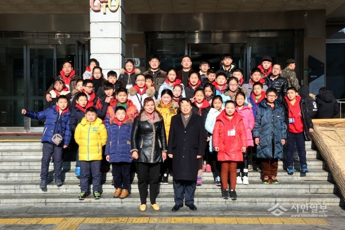 지난 23일 서울 구로구와 우호교류를 맺고 있는 중국 강소성 건호현 청소년이 구청을 방문해 구 문화·예술 등에 대한 전반적인 설명을 들으며 견학을 실시했다. 사진은 이성 구청장(가운데 오른쪽)이 건호현 청소년들과 함께 기념촬영을 하고 있는 모습.(사진제공=구로구청)