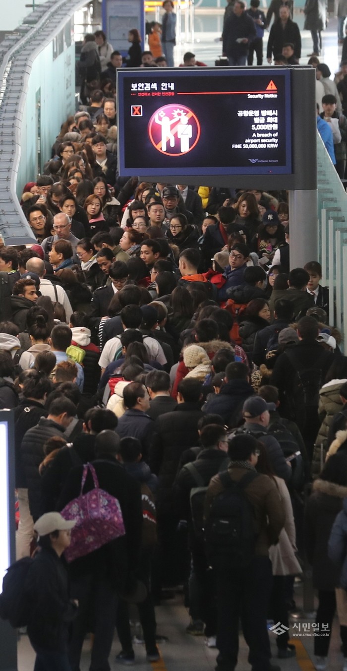설 연휴를 앞둔 25일 인천공항이 출국객들로 붐비고 있다. 이날 인천국제공항공사는 설 연휴 하루 전날인 26일부터 30일까지 닷새 동안 41만6천700여 명이 인천공항을 통해 출국할 것으로 예측했다.