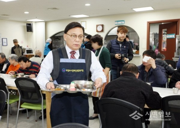 경기 의정부시의회 박종철 의장이 민족고유의 명절인 설날을 맞아 의정부시장애인종합복지관을 방문해 복지관 이용객들에게 떡국을 전달하고 있다. (사진제공=의정부시의회)