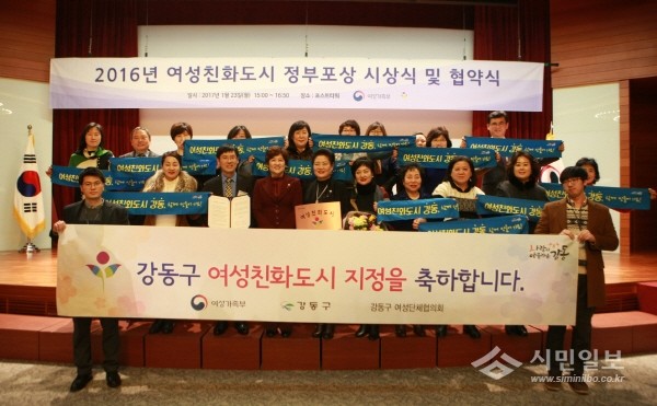 최근 서울 강동구가 명동 프레스타워 대회의실에서 본격적인 여성친화 정책 추진을 위해 여성가족부와 여성친화도시 협약을 맺었다. 사진은 협약식에 참석한 구청 관계자들이 플래카드를 들고 기념촬영하는 모습.(사진제공=강동구청)