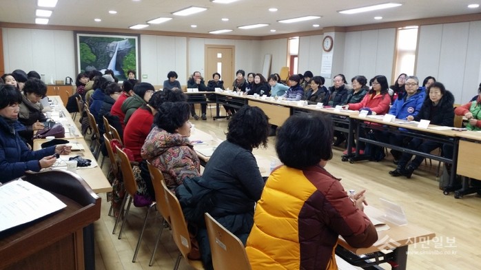 최근 경기 안산시 성포동 주민센터에서 60여명의 통장들이 참석한 가운데 ‘2017년 첫 통장정례회의’를 개최했다. 사진은 정례회의에 참석한 통장들이 2017년 달라지는 주요 제도 및 사업 교육을 받고 있는 모습.(사진제공=안산시청)