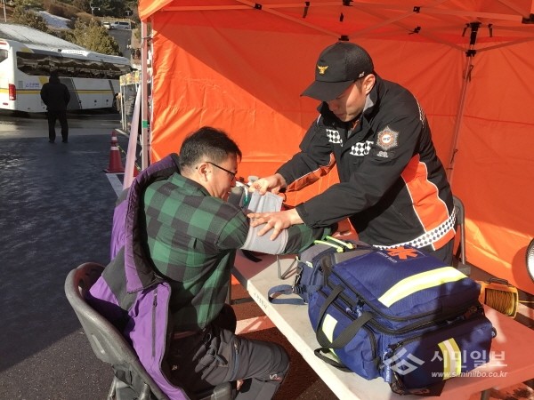 은평소방서는 최근 경기 파주시 용미리 시립묘지에 설 연휴 귀성객들의 안전한 고향 방문과 성묘를 위한 119구급대를 근접 배치했다. 사진은 소방관이 시민을 대상으로 혈압체크를 하는 모습.(사진제공=은평소방서)