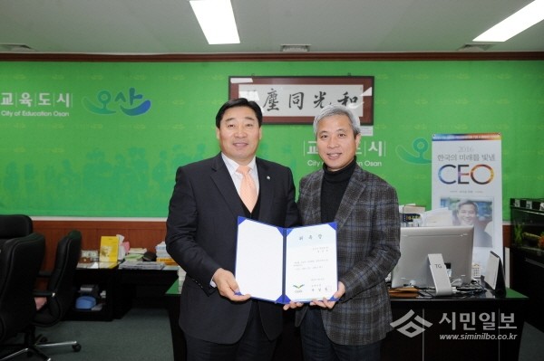 최근 경기 오산시는 아동권리 보장을 위한 독립적 인권기구인 아동권리 옴부즈퍼슨에 김근식 법사랑위원 오산지구협의회 사무국장을 위촉했다. 사진은 곽상욱 시장(오른쪽)과 김 사무국장(왼쪽)이 기념촬영하는 모습.(사진제공=오산시청)