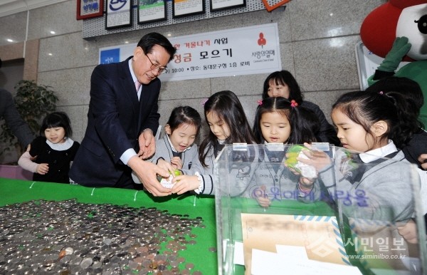동대문구는 지난 1일 동대문구청 1층 로비에서 ‘2017 따뜻한 겨울나기’ 행사의 일환으로 ‘사랑의 성금 모으기 행사’를 개최했다. 사진은 유덕열 구청장과 어린이들이 사랑의 성금을 전달하고 있는 모습.(사진제공=동대문구청)