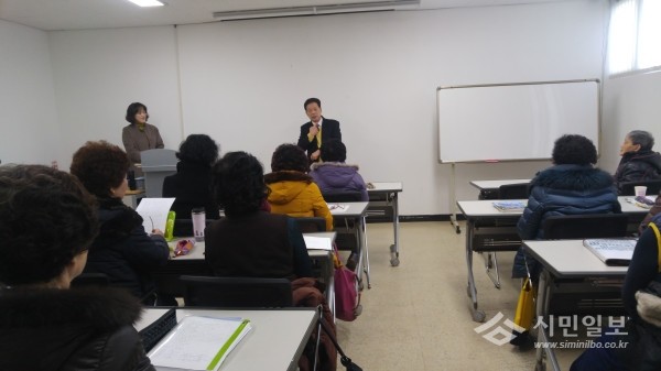 최근 충남 아산도서관은 노인을 위한 예비중학과정 ‘제2기 청춘교실’ 개강식을 가졌다. 사진은 개강식에 참석한 박순규 도서관장이 인사말을 하는 모습.(사진제공=아산교육지원청)