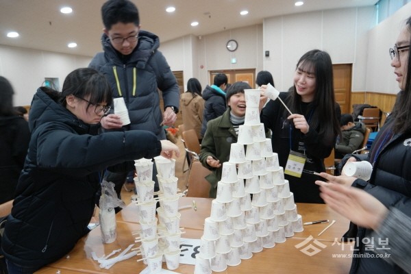 경기 양평군종합사회복지관이 최근 청소년자원봉사계절학교 ‘청소년 인성 쑥쑥 프로그램’을 진행했다. 사진은 프로그램에 참여한 학생들이 종이컵 쌓기를 진행하는 모습.(사진제공=양평군청)