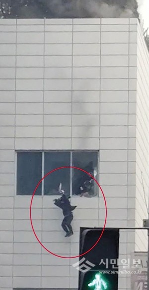 4일 오전 경기도 화성 동탄 메타폴리스 부속상가 3층에서 불이 나 4명이 숨지고, 40여명이 연기를 흡입했다. 상가에 있던 시민이 3층 유리창을 통해 소방대가 설치한 에어매트로 뛰어내리고 있다.