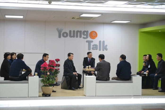 경기 수원시 영통구는 지난 3일 구청 1층 로비에 조성된 휴게 공간 'Young 通 Talk'에서 이상훈 구청장(가운데)을 비롯한 각 부서장들이 ‘시민을 위한 열린 행정’의 실현방안을 강구하기 위한 티타임을 진행했다.(사진제공=영통구청)