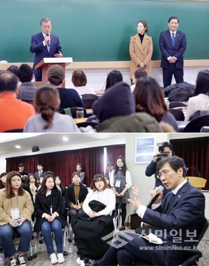 더불어민주당 문재인 전 대표가 6일 오후 서울 노량진 학원을 방문해 공무원 시험 준비생들을 격려하고 있다(위). 안희정 충남지사가 6일 오전 충남도청 소회의실에서 열린 아르바이트 대학생과의 간담회에서 학생들의 질문에 답변하고 있다.