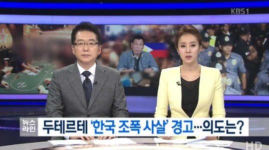 두테르테는 지난 4일 자신의 고향인 필리핀 남부 다바오시에서 기자회견을 열고 "한국 조폭들이 세부에서 매춘, 마약, 납치에 관여하고 있다는 정보를 보고받았다"며 "불법을 자행하는 한국인은 외국인이라고 특권을 누릴 수 없고 내국인 범죄자들과 똑같은 처벌을 받게 될 것"이라고 말했다고 현지 매체 인콰이어러가 보도했다.