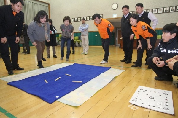 서울 은평소방서는 지난 6일 오후 본서 4층 대강당에서 심재강 서장(가운데)을 비롯한 소방공무원과 의용소방대원 30여명이 참여한 가운데 '알콩달콩 윷놀이 대회'를 개최했다. 사진은 참여자들이 즐겁게 윷놀이를 하는 모습.(사진제공=은평소방서)
