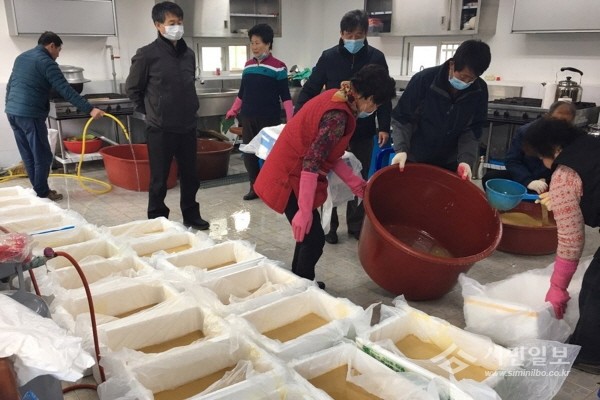 지난 6일 인천 강화군 송해면 지역사회보장협의체가 2017년 새해 첫 사업으로 여성 노인들을 위한 빨랫비누를 만들어 지역내 67가구에 전달했다. 사진은 빨랫비누를 제작하고 있는 모습.(사진제공=강화군청)