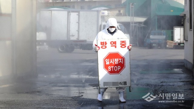 7일 오후 대전 대덕구 한 도축장직판장에서 업체 관계자가 방역 안내판을 옮기고 있다. 축산당국은 전날 충북 보은에 이어 전북 정읍에서도 구제역 신고가 들어오자 전국 모든 축산농가에 일시 이동중지명령(스탠드스틸·Standstill)을 발동했다.