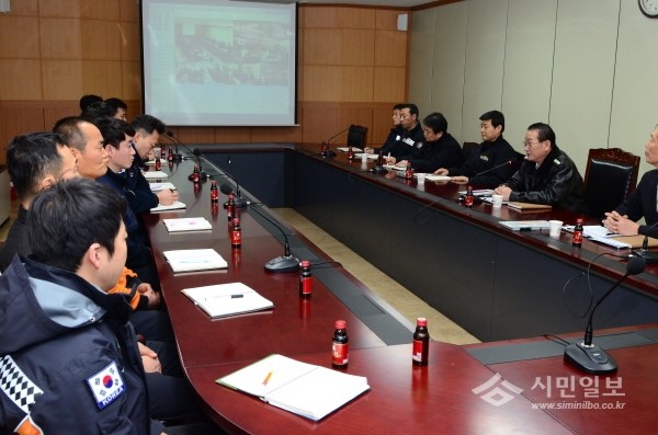 지난 7일 서울 영등포소방서는 소방서 3층 소회의실에서 현장대응단 및 각 119안전센터 차량담당자를 대상으로 교통사고 예방을 위한 영상토론회를 실시했다. 사진은 이귀홍 서장 및 관계자들이 회의하는 모습.(사진제공=영등포소방서)