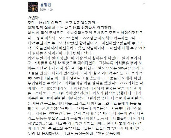 8일 윤형빈은 자신의 SNS에 한 개의 글을 게재했다. 그는 ‘너무 화가 나서 안되겠다’라는 문장으로 글을 시작하며 송가연을 비판하고 있다. 이는 송가연이 로드 FC 정문홍 대표에게 성적 비하와 모욕을 느꼈다고 주장한 것에 반박하는 내용이다.