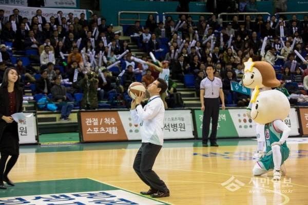 강동구 경기 부천시의회 의장이 지난 8일 오후 7시 부천체육관에서 개최된 부천 KEB하나은행 여자 농구단 홈경기에서 시투를 하고 있다.