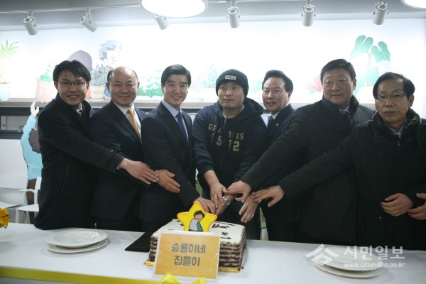 서울 강동구가 지난 8일 오후 3시 성내동 강풀만화거리에 위치한 '승룡이네 집' 개관식을 진행했다. 사진은 행사에 참여한 이해식 구청장(왼쪽 세 번째), 만화가 강풀(가운데), 조동탁 구의회 의장(오른쪽 세 번째)등이 떡 케이크 절단식을 진행 중인 모습.(사진제공=강동구청)