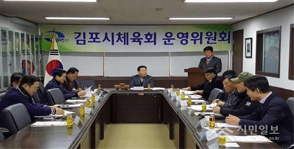 경기 김포시체육회가 지난 7일 사무국 회의실에서 2017년도 제1차 운영위원회를 개최했다. 사진은 정병규 시체육회 상임부회장 및 관계자들이 가맹경기단체 인준 등 주요 안건에 대해 심의하는 모습.(사진제공=김포시청)