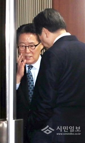 국민의당 박지원 대표(왼쪽)와 바른정당 김무성 의원이 9일 오후 국회 본회의장에서 나와 긴밀히 얘기를 나누고 있다.