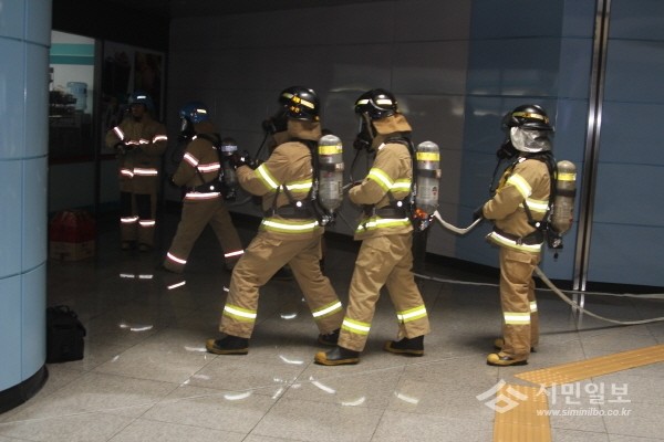 경기 부천소방서는 10일 오전 춘의역에서 소방차량 8대와 소방관 및 춘의역 자위소방대원 40여명이 참가한 가운데 합동 소방훈련을 실시했다. 사진은 방화복을 입은 소방관들이 소방호스를 들고 있는 모습.(사진제공=부천소방서)