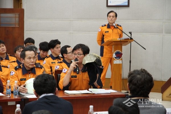 서울 동작소방서는 지난 9일 소방서 3층 강당에서 소방공무원 및 유관기관 관계자들이 참석한 가운데 지난 3일 발생했던 상도동 건영약수맨션 화재 건에 대한 화재방어 검토회의를 개최했다. 사진은 소방공무원이 의견을 제시하는 모습.(사진제공=동작소방서)