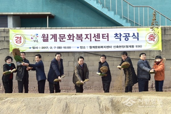최근 노원구는 문화복합서비스를 위한 시설인 ‘월계문화복지센터’를 착공식을 개최했다. 사진은 김성환 구청장(오른쪽 네번째), 고용진 국회의원(오른쪽 세번째), 정도열 구의장(가운데) 등 관계자들이 시삽식을 하는 모습.(사진제공=노원구청)