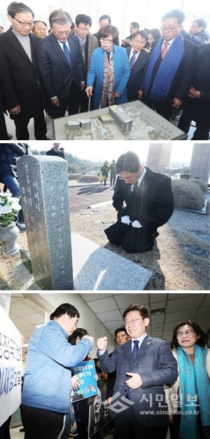 12일 오전 문재인 더불어민주당 전 대표가 전북 전주시 완산구 국민연금공단 기금운용본부를 찾아 기금운용본부 조형물에 대한 설명을 듣고 있다(위부터). 더불어민주당 대선주자인 안희정 충남지사(오른쪽)가 12일 오전 광주 북구 운정동 국립 5·18민주묘지를 찾아 전영진 열사 묘소를 참배하고 있다. 이재명 성남시장이 12일 오전 경북 안동시청에서 지지자들을 만나 인사하고 있다.