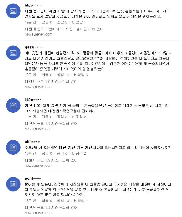 네티즌들은 "eunb**** 진앙이 얕아도 1.9에 이만큼 쿵 소리가 나나요" "jyeo**** 건물이 한번 쾅한 느낌" "kne2**** 안 예민한데 흔들림을 심하게 느낀건 뭐져" "eunb**** 저 정도 굉음이랑 거의 모든 사람이 들을 정도였다면 1.9가 아닐거란게 문제임" "kaix**** 대전 유성구 관평동 입니다. 분명 아파트가 흔들렸고 쾅하는 소리도 들렸습니다" 등의 반응을 남기고 있다.