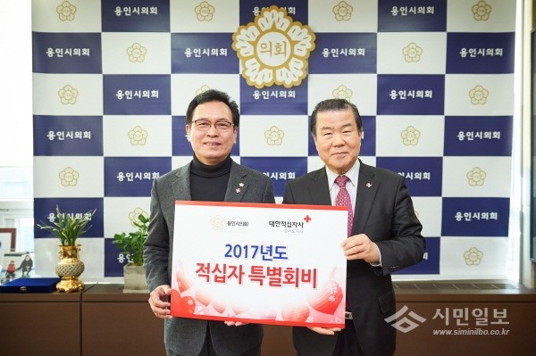 [용인=오왕석 기자]경기 용인시의회 김중식 의장은 최근 의장실에서 대한적십자사 경기도지사 김훈동 회장에게 적십자 특별회비 100만원을 전달하고, 특별회원증을 받았다.