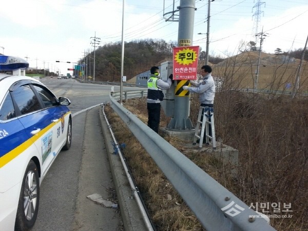 최근 충남 아산경찰서 도고선장파출소 경찰관들은 교통사고 예방을 위해 아산시 도고면 시전리 21번 국도, 선장면 623, 645지방도 등 교통사고 위험지역에 교통안전 걸개를 부착했다.(사진제공=아산경찰서)