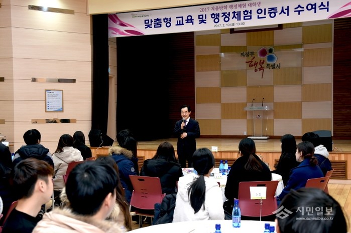 경기 의정부시는 지난 10일 겨울방학 행정체험 대학생들에게 '취업 마인드와 성공'이라는 주제로 맞춤형 교육을 실시하고 행정체험 인증서를 수여했다. 사진은 안병용 시장이 인사말을 하는 모습.(사진제공=의정부시청)