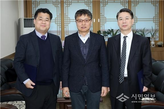 | ▲ 김기래 중구의장(가운데)이 이은일 변호사(오른쪽)와 권정 변호사(왼쪽)에게 위촉장을 전달하고 기념촬영을 하고 있다. | ||