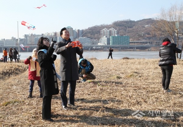 최근 서울 강동구 광나루 한강시민공원에서 민주평화통일자문회의 강동구협의회 주관으로 열린 ‘제6회 통일염원 연날리기 대회’에 참가한 조동탁 의장(가운데)이 지역 주민들과 함께 연날리기를 하고 있다.(사진제공=강동구의회)