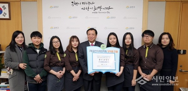 금천구 청소년문화공간 ‘꿈꾸는 나무’를 운영하고 있는 ‘꿈나운영단’ 청소년들이 지난 13일 ‘금천미래장학회’에 장학금 100만원을 전달했다. 사진은 차성수 구청장(가운데)과 청소년들이 기념촬영을 하는 모습.(사진제공=금천구청)