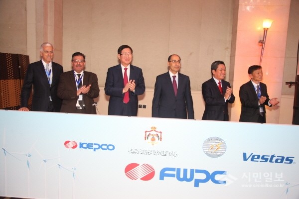 | ▲ (왼쪽부터) 마르코 그라지아노 Vestas 사장, 압델-파타 알리-파야드 엘 다라드카 NEPCO 사장, 조환익 한전 사장, 이브라힘 사이프MEMR 장관, 이범연 주요르단 한국대사, 정동일 푸제이즈 법인장. | ||
