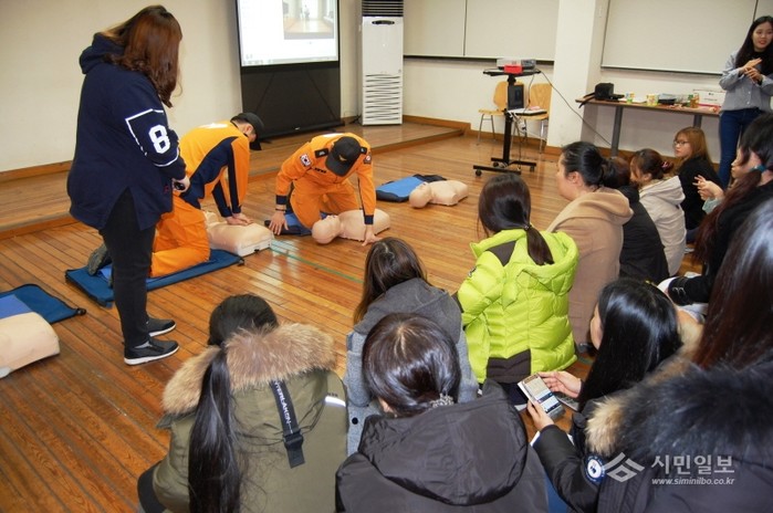 경기 오산소방서는 지난 14일 오산시 다문화가족지원센터에서 다문화가정 결혼이민자를 대상으로 ‘찾아가는 소방안전체험교실’을 운영했다. 사진은 소방관들이 심폐소생술 교육을 진행하는 모습.(사진제공=오산소방서)
