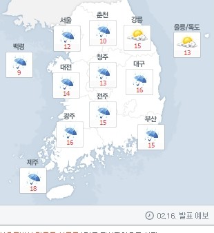 오후에는 서울 12도, 춘천 10도, 대전 14도, 청주 13도, 부산 15도까지 오르고 전국적으로 비가 내린다.