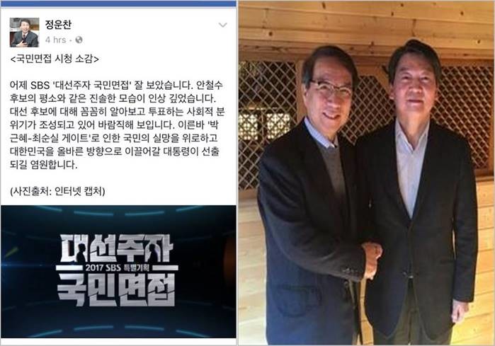 16일 오전 정운찬 이사장은 자신의 페이스북을 통해 “어제 SBS '대선주자 국민면접' 잘 보았습니다. 안철수 후보의 평소와 같은 진솔한 모습이 인상 깊었습니다”고 밝혀 이목을 집중시켰다.