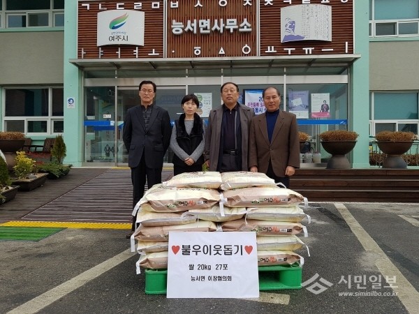 최근 경기 여주시 능서면 이장협의회는 능서면사무소를 방문해 어려운 이웃들을 위해 사용해 달라며 20kg 쌀 27포를 기탁했다. 사진은 관계자들이 쌀 전달 후 기념촬영하는 모습.(사진제공=여주시청)