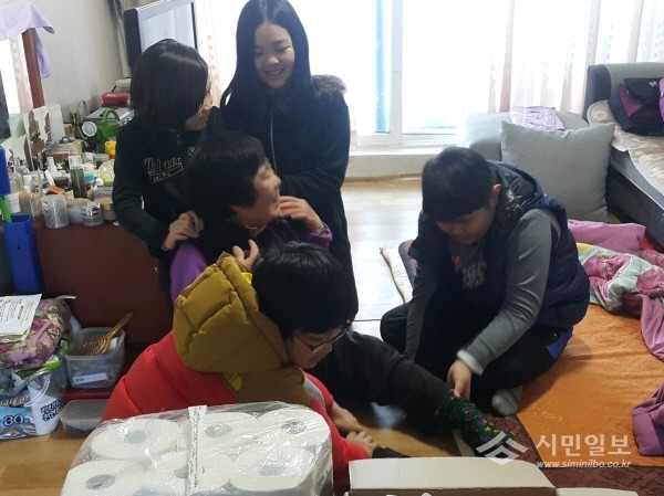 세종시 연기면 수왕초등학교 4학년 학생들은 알뜰바자회로 모은 13만원의 수익금으로 세제, 화장지 등 생필품을 구입해 17일 연기면 지역내 홀몸노인가정 2곳에 전달했다. 사진은 학생들이 노인의 어깨를 주무르는 모습.(사진제공=세종시청)