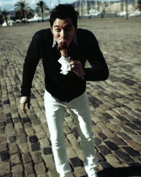 공유는 화보에서 화이트 컬러의 스니커즈와 팬츠에 블랙 브이넥과 셔츠 남방을 입고 아이스크림을 먹으며 카메라를 응시하고 있다.