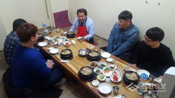 최근 경기 수원시 영통구 매탄2동은 복무 중인 사회복무요원과의 간담회를 실시했다. 사진은 매탄2동장과 사회복무요원들이 식사를 하며 이야기를 나누는 모습.(사진제공=수원시청)