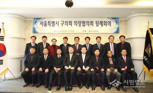 | ▲ 마포구에서 개최된 서울시 구의회의장협의회에 참석한 각 자치구 의장들이 기념촬영을 하고 있다. | ||