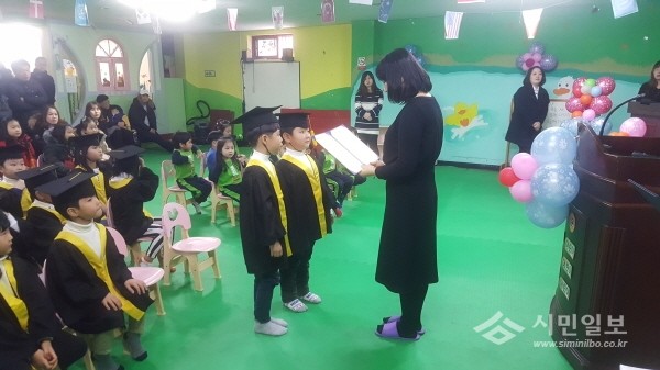 지난 18일 전남 목포시 양을로 소재 '좋은 친구 어린이집'에서 부모들과 어린이들이 참석한 가운데 졸업식이 진행됐다. 사진은 어린이집 교사가 어린이들에게 졸업장을 전달하는 모습.(사진제공=황승순 기자)