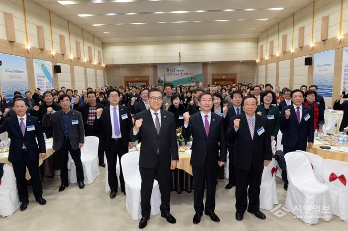 인천 연수구는 지난 17일 유정복 인천시장의 방문을 맞아 구정 주요 현안사항에 대한 논의 및 지역현안 시민대화를 진행했다. 사진은 유 시장(가운데) 및 이재호 구청장(왼쪽)이 '파이팅'을 외치는 모습.(사진제공=연수구청)