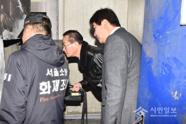 지난 20일 서울 영등포소방서는 지난 18일 오후 5시12분경 발생한 여의도동 화재현장을 방문해 화재현장 화재원인 및 소방시설 운영 상황 등에 대한 긴급점검을 실시했다. 사진은 이귀홍 서장(가운데)이 화재현장을 살펴보는 모습.(사진제공=영등포소방서)