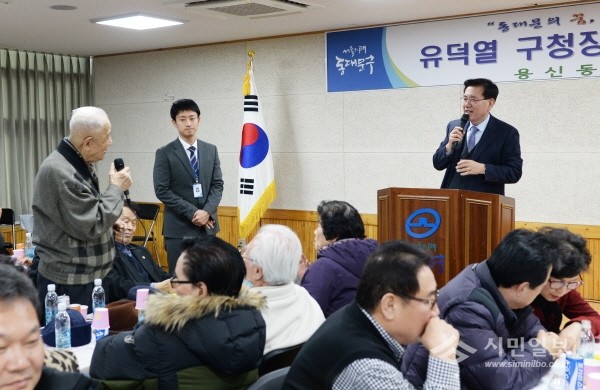 동대문구는 지난 20일 오후 3시 용신동 주민센터에서 풀뿌리 민주주의 구현을 위한 동정보고회를 개최했다. 사진은 유덕열 구청장이 주민들과 이야기를 나누는 모습.(사진제공=동대문구청)